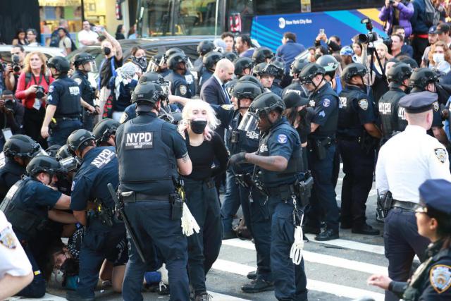 6 月 10 日,在美国纽约曼哈顿下城联邦广场移民法庭附近,警察控制抗议者。新华社记者刘亚南摄