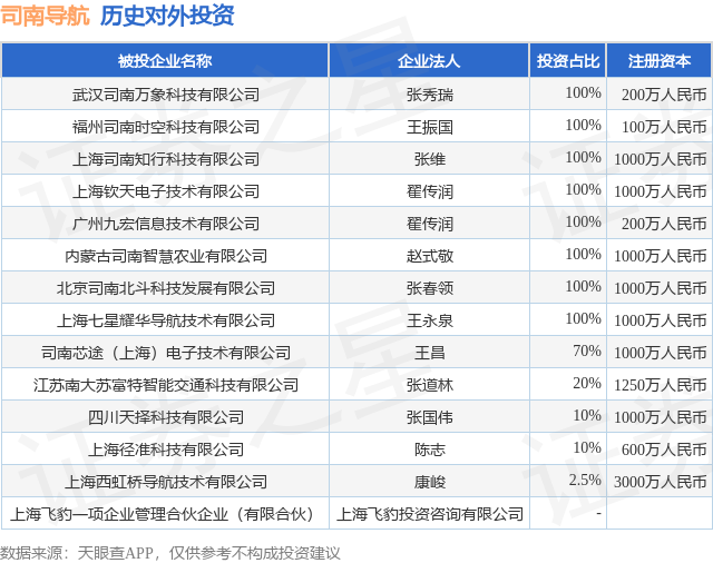 本站消息,根据天眼查APP显示,司南导航(688592)新增一起对外投资事件华瑞优配,被投资公司为上海飞豹一项企业管理合伙企业(有限合伙),法定代表人上海飞豹投资咨询有限公司,投资占比为-。该公司从事商务服务业,注册资本为。目前,司南导航共存在对外投资14项,详见下表: