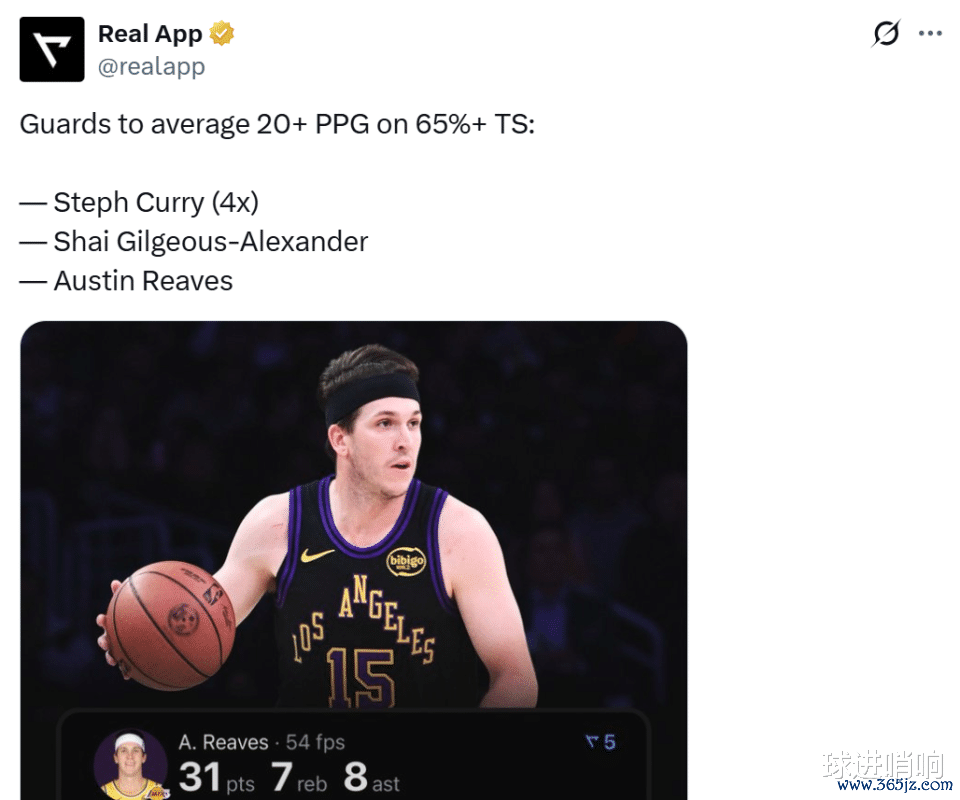 本赛季里夫斯可谓是高产又高效,场均可以轰下23.7分,真实命中率高达65.1%,是NBA历史上第三位做到这一点的后卫球员,另外两人是库里(4次)和亚历山大,可见这一项纪录的含金量之高。