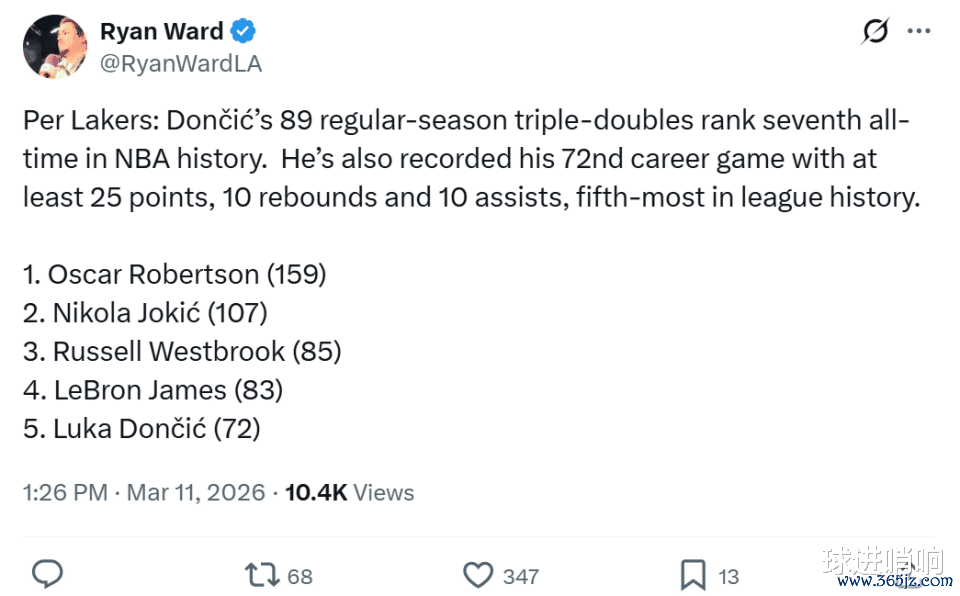 这是东契奇加盟湖人仅一个赛季第6次拿下30+三双,成功超越名宿科比,独占湖人队史第五。