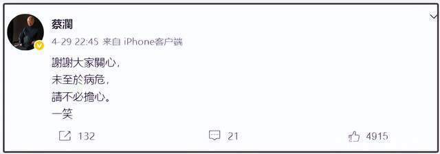蔡澜助理发文称“蔡澜正在康复,一切安好”,将用法律手段惩戒造谣博流量的无底线行为。助理还透露蔡澜身体只是小毛病,并不是特别严重,相关回应蔡澜均转发支持 。而蔡澜本人也单独发文回应谣言,感谢大家关心他的健康,但没有到病危的程度,让大家不要担心。可见他本人的心态还是保持得很好。