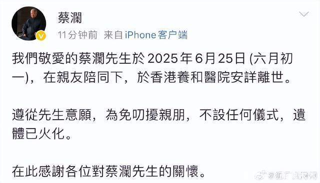 6月27日,有网友分享了一张悼念蔡澜去世的朋友圈百事达配资,引发热议。随后,蔡澜的微博由身边人发布证实,表示:“我们敬爱的蔡澜先生于2025年6月25日(六月初一),在亲友陪同下,于香港养和医院安詳离世。”