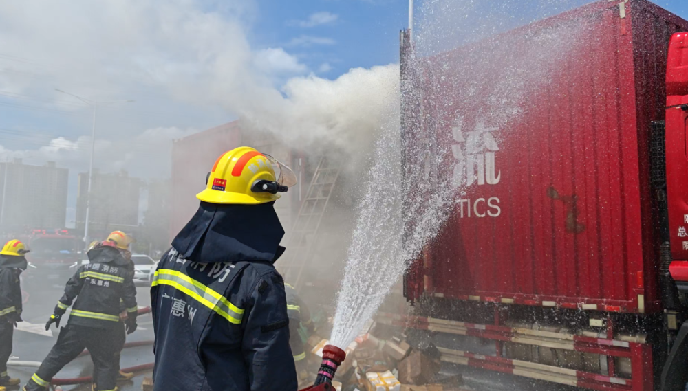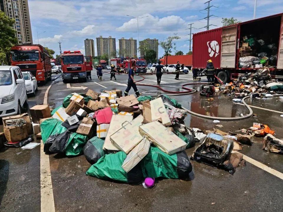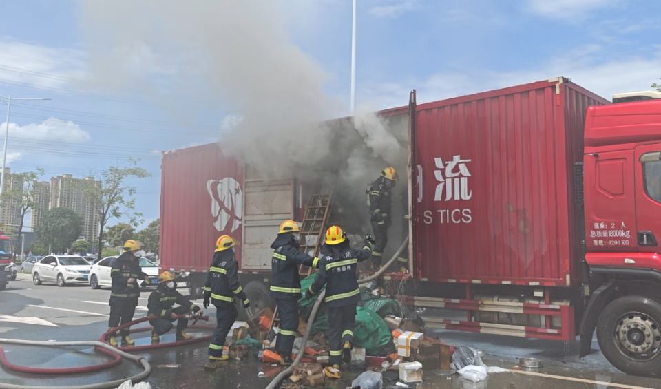现场消防救援人员第一时间设置警戒区域,疏散周边无关人员和车辆。随后,现场指挥员迅速组织人员出两支水枪对货柜箱进行降温处理,并抢救未被烧毁的物资。