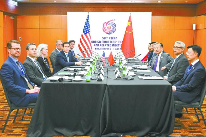 7月11日,在马来西亚吉隆坡出席东亚合作年度系列外长会期间,中共中央政治局委员、外交部长王毅会见美国国务卿鲁比奥。双方就中美关系以及共同关心的问题交换了意见,“一致认为会晤是积极、务实、建设性的”。国际媒体普遍表示,这是今年1月新一届美国政府上台以来,两国高层会谈之一,也是王毅与鲁比奥的首次面对面会晤,双方的积极对话将增加两国元首举行峰会的可能性,从而进一步缓和美中紧张关系。11日接受《环球时报》记者采访的专家表示,这次会晤有助于中美双方就当前面临的双边、多边、区域以及全球议题交流看法,认识彼此核心关切,对于美方更冷静、理性、务实处理涉华问题也会有积极作用。与此同时,按照路透社等媒体的说法,这是鲁比奥就任美国国务卿以来的首次亚洲之行,是美国将目光投向中东和欧洲冲突之外、重新聚焦印太地区的努力之一。但近期美国不断升级的关税威胁,以及对亚洲盟友日益增多的国防支出要求,给鲁比奥此次亚洲之行蒙上一层阴影。