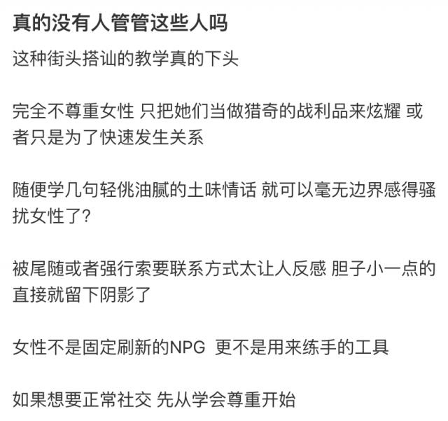 除了传授技巧,许多男性博主还会大肆向粉丝鼓吹搭讪的重要性,鼓励男性走上街头,像集邮般索要女性的微信,声称这样能够"提升情商"、"锻炼胆量"、"对女性祛魅"。就算被拒绝也没关系,因为"量大出奇迹"——只要搭讪次数够多,总能加到女性的微信,而只要搭讪够 100 个女性,"你就不会再有情感问题"。