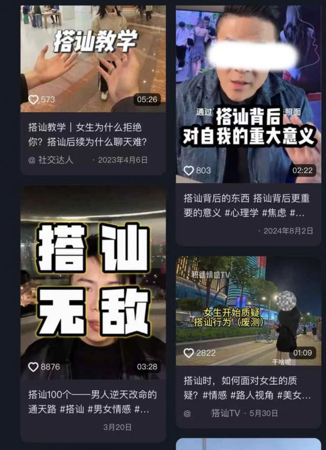 如今在短视频平台,有一大批教男性如何搭讪陌生女性的账号。这类账号一般命名为" XX 社交"、" XX 搭讪王"、" XX 情感 TV ",博主都是男性,自称情感导师,他们通常会在步行街、商场、地铁站等人流量大的地方广撒网,随机挑选女性搭讪,并拍下女性的真实反应,多数未经同意便剪辑成视频发到网上,以此获得巨大的流量。